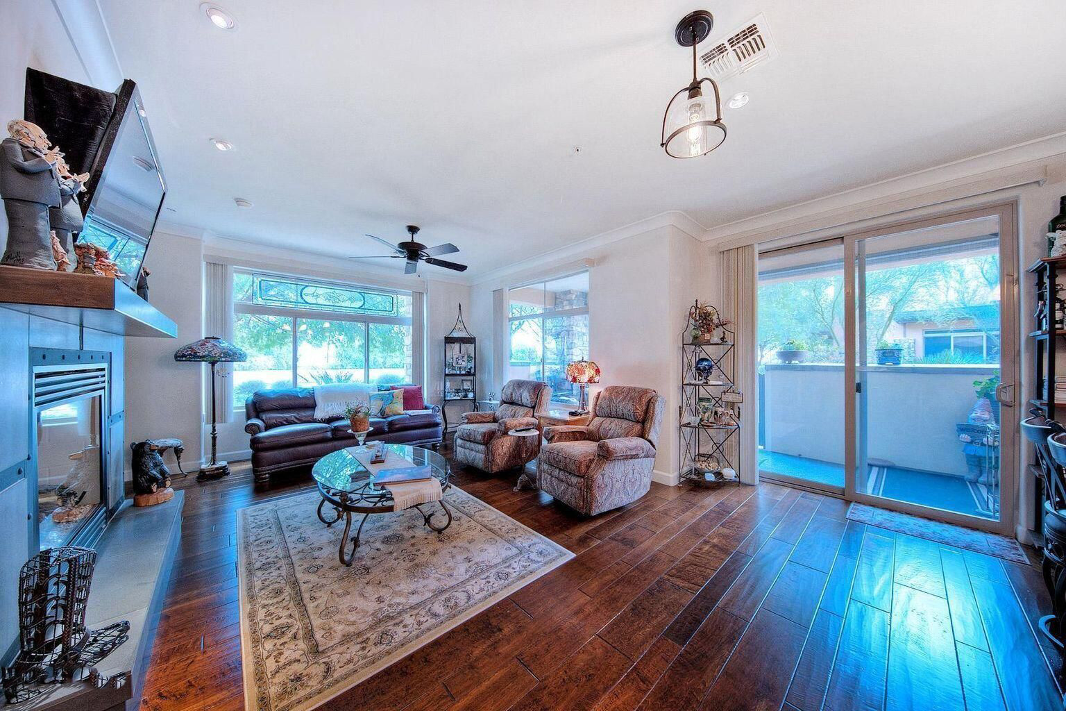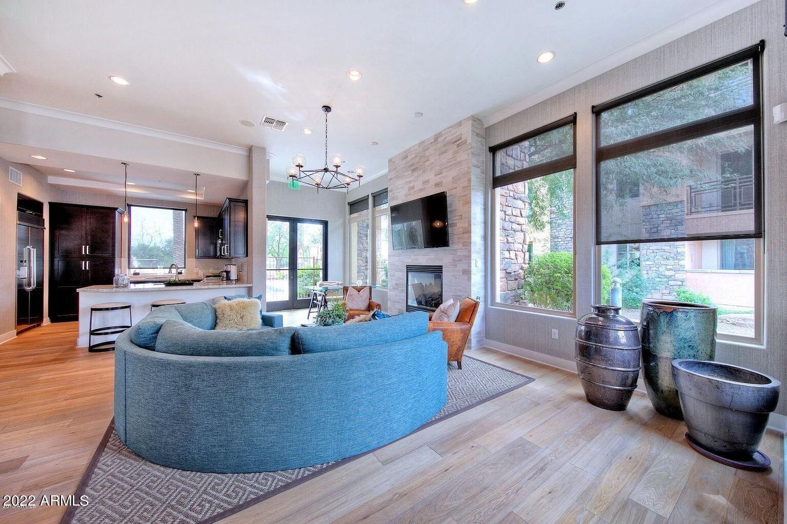 Great location within walking distance to Fashion Square mall and upscale bars & restaurants in Oldtown Scottsdale. This spacious open-concept floor plan has the view of canal and comes with high ceilings, solid finish interior doors, dark oak hard wood floors, chefs kitchen equipped with Décor high-end stainless appliances, solid surface counters with granite in kitchen & lime-stone in bath(s), inviting living room with gas fireplace, spacious master retreat with spa-like bath finishes. Ground floor unit with no stairs, preferred end-corner unit that has great privacy which is nestled along canal. Individual electric vehicle charging in the garage. All furniture available per separate bill of sale.